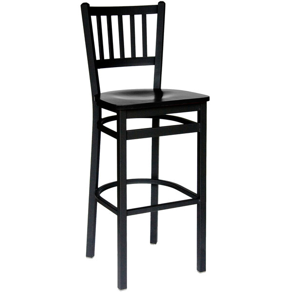 Whether patrons are cozying up to your bar at happy hour, indulging in a delicious breakfast, or watching the world pass by in your window-side dining area, this simple yet attractive BFM Seating 2090BBLW-SB Troy sand black metal bar height chair is sure to present them with a comfortable place to perch! Its backrest boasts a unique slat back design, while adding a distinct visual appeal to your restaurant, bar, cafeteria, or game room. Contoured for comfort, the black wooden seat also features sleek coloring to complement any decor. The sand black metal frame gives the chair a durable, stable foundation for a weight capacity of 250 lb., and it also includes glides at the bottom of each leg to help protect your floors. Designed to slide smoothly, these glides ensure that the stool moves quietly to keep unwanted noise to a minimum. Plus, an integrated footrest adds further support and comfort your customers will love. Overall Dimensions: Height: 43 3/4″ Depth: 18 1/4″ Seat Width: 17 1/2″ Seat Depth: 16 1/2″ Seat Height: 30″ Capacity: 250 lb.