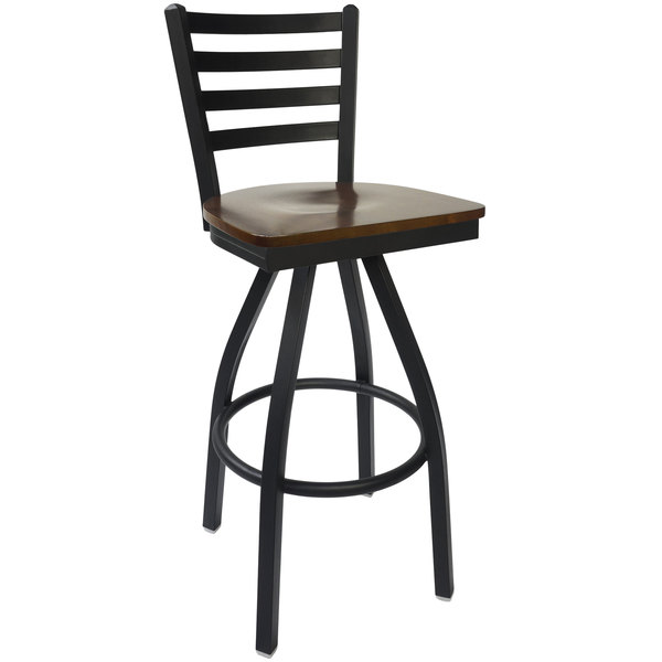 Seat your patrons comfortably at any bar or cafe with the BFM Seating 2160SWAW-SB Lima bar height swivel chair. Its back rest features a ladder design that provides unmatched comfort while maintaining a distinct look for your restaurant. The swivel design allows patrons to turn in their chairs to comfortably socialize and fully enjoy your venue. A contoured, walnut-finished wood seat brings exceptional comfort. Its steel legs are all connected with supports to ensure superb stability, while white nylon glides are capped on the bottom of the legs to protect your floors for years to come at your pizzeria, bar, deli, or restaurant. Overall Dimensions: Height: 42″ Depth: 18 1/4″ Seat Width: 17 1/2″ Seat Depth: 16 1/2″ Seat Height: 30″ Capacity: 250 lb.