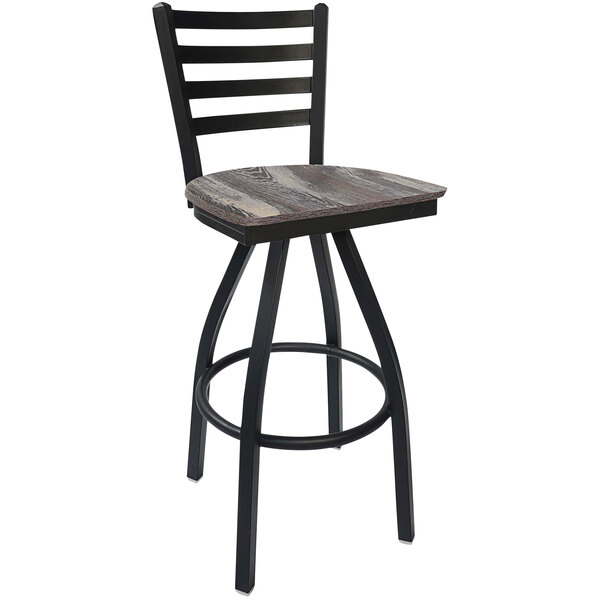 Seat your patrons comfortably at any bar with this BFM Seating Lima sand black steel swivel barstool with Relic farmhouse seat. This barstool boasts a durable, 18-gauge welded steel frame that offers a sturdy foundation that is able to withstand daily, heavy-duty use. The frame’s sand black coating provides added resistance to nicks and scratches while adding a sleek, modern look. This barstool features a Relic farmhouse seat with a contoured, textured melamine design to provide your guests with a comfortable seat while offering the beautiful look and feel of real wood to your dining area. This Relic seat supplies superior durability in indoor settings, guarding against scratches, scrapes, and other abrasions, as well as water damage caused by condensation. Its swivel design allows guests to turn comfortably in their seats and socialize with others while taking in the fullness of your venue. Plus, white nylon glides are capped on the bottom of each leg to help reduce noise and protect your floors for years to come. Overall Dimensions: Width: 17 1/4″ Depth: 17 3/4″ Height: 42 1/2″ Seat Width: 16 1/2″ Seat Depth: 16 1/2″ Seat Height: 30 1/2″ Capacity: 250 lb.