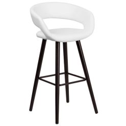 Add contemporary flair to any space with this Flash Furniture CH-152560-WH-VY-GG Brynn series cappuccino wood bar height stool with white vinyl seat! This stool features a smooth, white vinyl seat that contours comfortably to each user so that they can sip cocktails, share appetizers, or socialize at ease and in style. The rounded low back reduces lower back pressure, and a foot rest provides additional comfort. Arm rests ensure a soft, designated place for guests to rest their arms. Cappuccino wood finished legs are capped with protective floor glides to keep your floors in pristine condition. The lightweight design is easy to move and transport and is best suited for low-traffic areas or light-duty use. Make sure you have plenty of seating available with this Flash Furniture bar height stool! Overall Dimensions: Width: 22″ Depth: 19″ Height: 39″ Capacity: 330 lb. Seat Dimensions: Width: 16″ Depth: 15 1/2″ Height: 29 1/2″ Back Dimensions: Width: 10″ Height: 10″