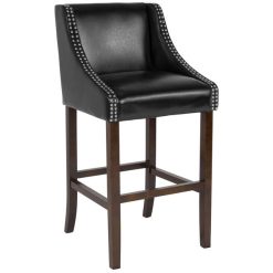 Dine and drink in style with this classy Flash Furniture CH-182020-30-BK-GG Carmel Series black leather bar stool with walnut frame and nail trim. This stool is a perfect addition to any space and is comfortable enough to relax in and elegant enough to complement brighter decor in a well-lit room as well. This classy bar height stool features a deep seat, supportive back, and nails accenting the curve of the arms. The LeatherSoft upholstery mimics the look and feel of real leather, but with added softness and durability to withstand constant use. In the absence of product-specific restrictions and weight limits, normal usage means use for no more than 40 hours per week by persons weighing 250 lbs. or less. This stool features added safety in the fire retardant foam padding that cushions the seat and back of the barstool. The sturdy walnut frame has a foot rest for added comfort and stability and is finished off with protective rubber floor glides to ensure the chairs tuck in smoothly and that your floors stay free from scuffs and scratches. The sleek black LeatherSoft upholstery seamlessly complements the walnut frame making this barstool easy to pair with the table or bar of your choice. This bar stool is not intended for commercial use. In the absence of product-specific restrictions and weight limits, normal usage means use for no more than 40 hours per week by persons weighing 250 lbs. or less. Overall Dimensions: Width: 20″ Depth: 22″ Height: 42″ Seat Dimensions Width: 17″ Depth: 17″ Height: 30″ Back Dimensions Width: 16″ Height: 13 1/2″