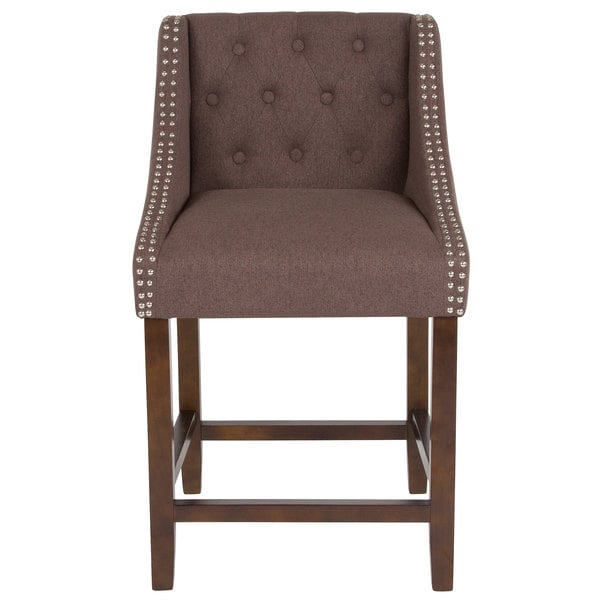 Dine and drink in style with this classy Flash Furniture CH-182020-T-24-BN-F-GG Carmel Series counter height stool in brown tufted fabric with walnut frame and nail trim accent. This stool is a perfect addition to any space and is comfortable enough to relax in and elegant enough to complement brighter decor in a well-lit room as well. This classy counter height stool features a deep seat, supportive back, and nails accenting the curve of the arms. The tufted brown fabric upholstery provides noble charm to this comfortable stool so that you can enjoy it day in and day out. This stool features added safety in the fire retardant foam padding that cushions the seat and back of the bar stool. The sturdy walnut frame has a foot rest for added comfort and stability and is finished off with protective rubber floor glides to ensure the chairs tuck in smoothly and that your floors stay free from scuffs and scratches. The brown upholstery seamlessly complements the walnut frame, making this bar stool easy to pair with the table of your choice. This bar stool is not intended for commercial use. In the absence of product-specific restrictions and weight limits, normal usage means use for no more than 40 hours per week by persons weighing 250 lbs. or less. Overall Dimensions: Width: 20″ Depth: 22″ Height: 36″ Capacity: 300 lb. Seat Dimensions: Width: 17″ Depth: 17″ Height: 24″ Thickness: 2″ Back Dimensions: Width: 16″ Height: 13 1/2″