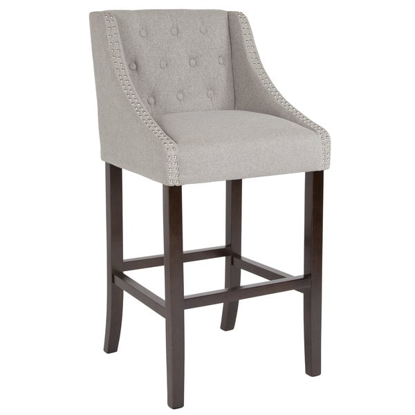Dine and drink in style with this classy Flash Furniture CH-182020-T-30-LTGY-F-GG Carmel Series light gray tufted fabric bar stool with walnut frame and nail trim. This stool is a perfect addition to any space and is comfortable enough to relax in and elegant enough to complement brighter decor in a well-lit room as well. This classy bar height stool features a deep seat, supportive back, and nails accenting the curve of the arms. The light gray tufted upholstery provides noble charm to this comfortable stool so that you can enjoy it day in and day out. This stool features added safety in the fire retardant foam padding that cushions the seat and back of the barstool. The sturdy walnut frame has a foot rest for added comfort and stability and is finished off with protective rubber floor glides to ensure the chairs tuck in smoothly and that your floors stay free from scuffs and scratches. The light gray tufted upholstery seamlessly complements the walnut frame making this barstool easy to pair with the table or bar of your choice. This bar stool is not intended for commercial use. In the absence of product-specific restrictions and weight limits, normal usage means use for no more than 40 hours per week by persons weighing 250 lbs. or less. Overall Dimensions: Width: 20″ Depth: 22″ Height: 42″ Seat Dimensions Width: 17″ Depth: 17″ Height: 30″ Back Dimensions Width: 16″ Height: 13 1/2″