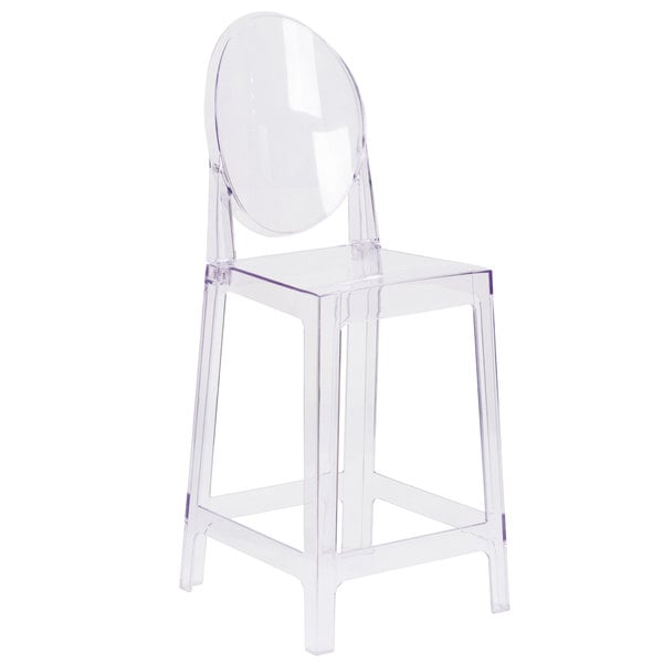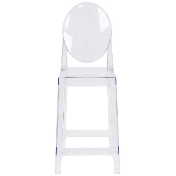 Outfit your modern indoor or outdoor dining area with this Flash Furniture OW-GHOSTBACK-24-GG Ghost transparent polycarbonate counter height stool with an oval back. The raised seat ensures guests are at a comfortable height to enjoy your signature drinks, appetizers, entrees, and desserts at your counter or bar. Meanwhile, the convenient footrest helps reduce the pressure on customers’ legs and lower backs to promote optimum relaxation. The transparent design emphasizes your business’ color scheme with a subtle, sleek presence and is great for catered events or weddings. A sturdy polycarbonate construction is designed for both indoor and outdoor use for versatility. For the convenience of your operation, the stool features 4 rubber glides, which help it to move smoothly over a variety of surfaces and prevent scratching. It boasts a 330 lb. weight capacity and a comfortable oval shaped back for optimal comfort. Provide convenient, stylish seating in your facility with this stool! Overall Dimensions: Width: 16 1/2″ Depth: 20 1/2″ Height: 42 1/2″ Seat Dimensions: Width: 14 1/2″ Depth: 15 1/2″ Height: 25″ Back Dimensions: Width: 12 3/4″ Height: 17 1/2″