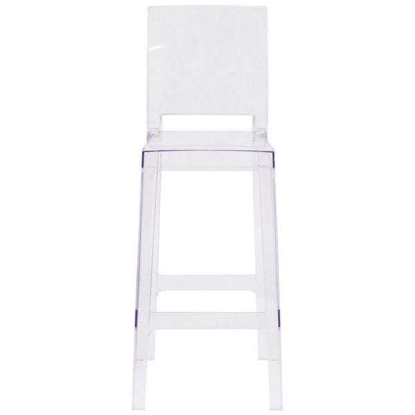 Outfit your modern indoor or outdoor dining area with this Flash Furniture OW-SQUAREBACK-29-GG Ghost transparent polycarbonate bar height stool with a square back. The raised seat ensures guests are at a comfortable height to enjoy your signature drinks, appetizers, entrees, and desserts at your counter or bar. Meanwhile, the convenient footrest helps reduce the pressure on customers’ legs and lower backs to promote optimum relaxation. The transparent design emphasizes your business’ color scheme with a subtle, sleek presence and is great for catered events or weddings. A sturdy polycarbonate construction is designed for both indoor and outdoor use. For the convenience of your operation, the stool features 4 rubber glides, which help it to move smoothly over a variety of surfaces and prevent scratching. It boasts a 330 lb. weight capacity and a comfortable square back for optimal comfort. Provide convenient, stylish seating in your facility with this chair! Overall Dimensions: Width: 17″ Depth: 20 1/2″ Height: 44 3/4″ Seat Dimensions: Width: 14 1/2″ Depth: 15 1/2″ Height: 29 3/4″ Back Dimensions: Width: 14″ Height: 15″