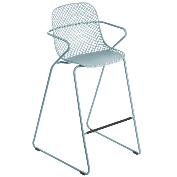Complement outdoor dining areas in your cafe, bistro, or restaurant bar with this timeless Grosfillex US139711 Ramatuelle ’73 blue ether stackable barstool. Inspired by both the scenic beauty and cultural aesthetic of the French Riviera, this metal barstool resurrects an iconic retro design combined with elements of contemporary style. With slim arms that flow into a pair of legs wrapped to form a stable base, this chair evokes the tranquil waters of the vast Mediterranean coastline. While the legs feature a strong powder-coated steel construction providing exceptional stability, the back of the stool is flexible for optimal comfort and features a crosshatch design reminiscent of rural fences or retro textiles. The dreamy blue ether finish of this barstool helps to establish a blissful atmosphere. The stool can be paired with a coordinating seat cushion (sold separately) to provide added comfort for your guests. Additionally, this stool is stackable to facilitate quick and easy overnight storage when desired. Mix it with other barstool colors (sold separately) to create a dynamic look tailored to the style of your business. Overall Dimensions: Width: 21″ Depth: 26″ Height: 44 1/2″ Seat Dimensions: Seat Height: 31″ Arm Height: 38 1/2″