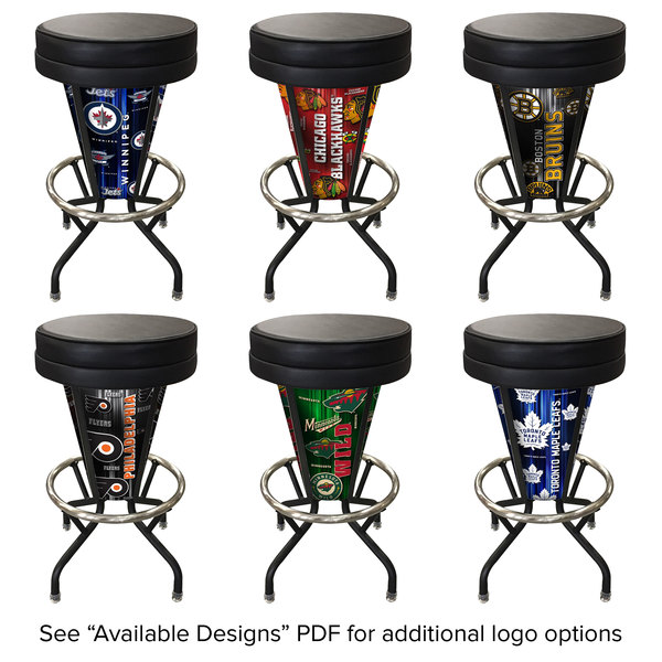 Add a comfortable, eye-catching seat to your operation while bolstering your guests’ enthusiasm with this Holland Bar Stool NHL logo indoor / outdoor LED bar stool! Guaranteed to stand out in dimly lit bars or out on a deck at nighttime, this stool features a rechargeable LED light that illuminates 4 lexan panels which surround the frame and feature a design of your choosing. Choose from designs featuring the unmistakable logos of all your favorite teams, ranging from the Anaheim Ducks all the way to the Washington Capitals. Simply check out the Available Designs resource and choose the appropriate product from the dropdown. The panels’ intricate designs are digitally printed with UV inks for the most vibrant colors possible. The light lasts up to 12 hours on a single charge and comes with a remote control that allows you to brighten, dim, and choose between 16 different color options. For an added layer of visual intrigue, you can also use flash, strobe, fade, and smooth transitional settings! With a spacious 16 1/2″ diameter, the seat is made from 2″ thick dense foam for maximum comfort and is covered by a resilient black woven-back vinyl. The vinyl is also marine grade, which makes this stool a great option for decks, seaside bars, and other outdoor areas. The sturdy stainless steel frame supports up to 350 lb. and has a foot ring to help keep your customers comfortable during long games. Sitting on self-leveling glides, the frame also features a swivel with 52 stainless steel ball bearings for smooth, easy movement. The swivel is so reliable, in fact, that it boasts a lifetime warranty! A great addition to bars, game rooms, and sports lounges, this stool is officially licensed by the NHL to ensure top-notch quality that’s sure to channel the spirit of a raucous stadium and have sports fans cheering. Overall Dimensions: Width: 17″ Depth: 17″ Height: 30″ Capacity: 350 lb. Seat Dimensions: Diameter: 16 1/2″ Thickness: 2″