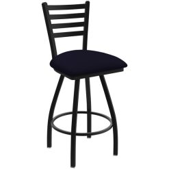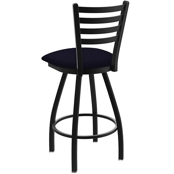 Complete your contemporary dining area with this Holland Bar Stool XL 410 Jackie 30″ ladderback swivel bar stool with black wrinkle finish and canter twilight seat. This stool features a durable, 16 gauge, 1 1/4″ tube steel frame with mig welded joints, providing outstanding durability. As a part of the XL line, its seat is 2″ wider and 1″ deeper than standard seats, making it perfect for patrons of all sizes and body types. Plus, it boasts an ample weight capacity of 750 lb. and a powder coated black wrinkle finish to resist scratches and chips. This bar stool is made with a supportive foot rest and back, and a breathable, 2 1/2″ thick foam cushion with vinyl cover. This cover is PVC-free with a sanitary anti-microbial/anti-bacterial coating. It is designed to look like leather and features an impressive 1,000,000 double rub durability, ensuring a long product life. The swivel design of this bar stool allows patrons to turn in their seats so they can comfortably socialize and fully enjoy your venue. This attractive, twilight colored seat with smooth canter design will add a modern touch to your bar and high top seating areas. Add this sturdy, stylish stool to your establishment to ensure your guests comfortably enjoy their dining experience! Overall Dimensions: Width: 22″ Depth: 21″ Height: 44″ Capacity: 750 lb. Seat Dimensions: Height: 30″