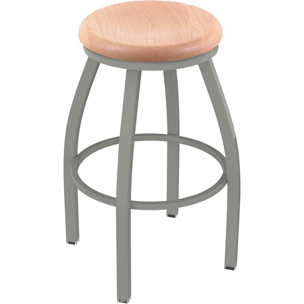 Complete your contemporary dining area with this Holland Bar Stool XL 802 Misha 30″ ladderback swivel bar stool with anodized nickel finish and natural oak seat. This stool features a durable, 16 gauge, 1 1/4″ tube steel frame with mig welded joints, providing outstanding durability. As a part of the XL line, its seat is 2″ wider and 1″ deeper than standard seats, making it perfect for patrons of all sizes and body types. Plus, it boasts an ample weight capacity of 750 lb., and a powder coated anodized nickel finish to resist scratches and chips. This bar stool is made with a supportive foot rest and a 1 1/4″ thick solid hardwood natural oak seat that is both attractive and comfortable for hours of use. The seat is finished with a 6 step process and sealed with catalyzed lacquer, ensuring a long product life. The swivel design of this bar stool allows patrons to turn in their seats so they can comfortably socialize and fully enjoy your venue. Its 30″ height is perfect for use at bars and high top seating areas. Add this sturdy, stylish stool to your establishment to ensure your guests comfortably enjoy their dining experience! Overall Dimensions: Width: 22″ Depth: 21″ Height: 44″ Capacity: 750 lb. Seat Dimensions: Height: 30″