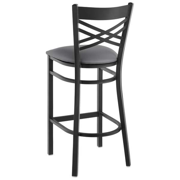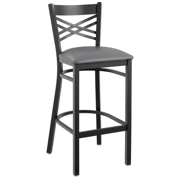 Seat your guests in comfort and style with this Lancaster Table & Seating black cross back bar height chair with dark gray padded seat. This bar height chair has a sleek and sturdy metal frame along with a comfortable and soft 2 1/2″ thick padded seat. Its back rest features a trendy cross back design that adds a modern look to any location. Because it is contoured for a customer’s back, it provides unmatched comfort while maintaining a distinct appearance. The convenient foot rest offers additional comfort to help your patrons relax and enjoy your venue. This bar height chair is designed with integrated plastic glides to protect your floors from scuffing. The black powder coat on the frame adds a modern touch and ensures longevity even through everyday wear and tear – resisting stains, scratches, and smudges. This reliable design ensures you’ll be using this bar height chair in your bar or restaurant for years to come! Overall Dimensions: Width: 17″ Depth: 19″ Height: 42 1/4″ Seat Width: 16 1/2″ Seat Depth: 16 3/4″ Seat Height: 29″ Capacity: 330 lb.