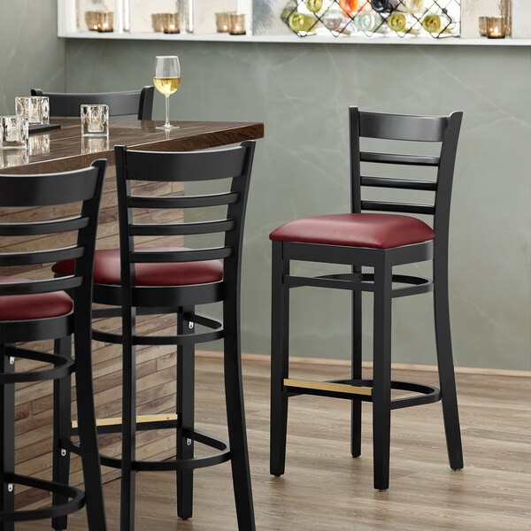Seat your guests in comfort and style with this Lancaster Table & Seating black ladder back bar height chair with burgundy padded seat. The glossy black finish gives you an elegant, upscale look, while the sturdy beechwood frame provides long-lasting durability. Plus, its eye-catching ladder back design is also contoured for a customer’s back, which provides unmatched comfort while maintaining a distinct look for your bar. At an ideal height for both bar and raised table seating, this chair is a versatile option for any restaurant, bar, deli, or coffee shop. The padded burgundy vinyl seat ensures comfort for your patrons while they enjoy one of your signature drinks or meals, plus it’s made of fire-retardant CAL 117 foam. For additional user convenience, the chair weighs less than 18 lb. for easy mobility from one destination to the next! This reliable design ensures you’ll be using this bar height chair in your pub or restaurant for years to come. Overall Dimensions: Width: 17″ Depth: 17″ Seat Width: 16 3/4″ Seat Depth: 17″ Seat Height: 30 1/2″ Height: 44″ Capacity: 300 lb.