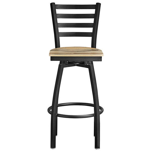 The Lancaster Table & Seating black top frame ladder back swivel bar height chair with driftwood seat is perfect for any bar, restaurant, bistro, or coffee shop. It offers the ultimate in style with its ladder back and sleek black coloring. Plus, its bar height allows you to use it at both bar counters and raised tables for a more interesting dining room layout.