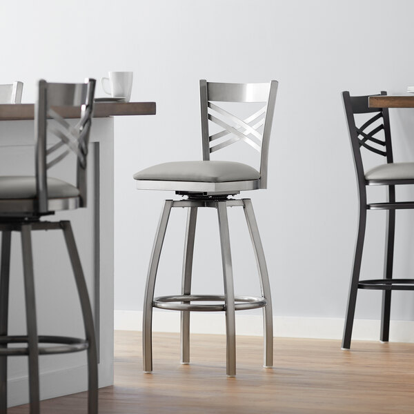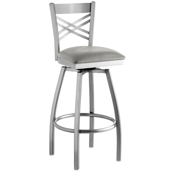 Seat your guests in comfort and style with this Lancaster Table & Seating clear coat cross back swivel bar height chair with light gray padded seat. This bar height chair has a sleek and sturdy metal frame along with a comfortable and soft 2 1/2″ thick vinyl padded seat. Its back rest features a trendy cross back design that adds a modern look to any location. Because it is contoured for a customer’s back, it provides unmatched comfort while maintaining a distinct appearance. The swivel design and foot rest allow patrons to turn in their chairs to comfortably socialize and fully enjoy your venue. This bar height chair is designed with integrated plastic glides to protect your floors from scuffing. The clear coat on the frame adds a contemporary touch and ensures longevity even through everyday wear and tear – resisting stains, scratches, and smudges. This reliable design ensures you’ll be using this bar height chair in your bar or restaurant for years to come! Overall Dimensions: Height: 44 1/2″ Seat Width: 16 3/4″ Seat Depth: 16 1/2″ Seat Height: 31 1/2″ Capacity: 300 lb.
