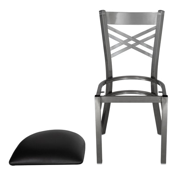 Featuring a comfortable 2 1/2″ thick padded vinyl seat, combined with a contemporary steel frame and trendy cross back design, this Lancaster Table & Seating clear coat steel cross back chair instills a modern look in any location. The seat is filled with CA117 fire-retardant foam for added safety, and, since the chair’s back is contoured for a customer’s back, it will provide unmatched comfort while maintaining a distinct appearance.
