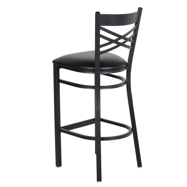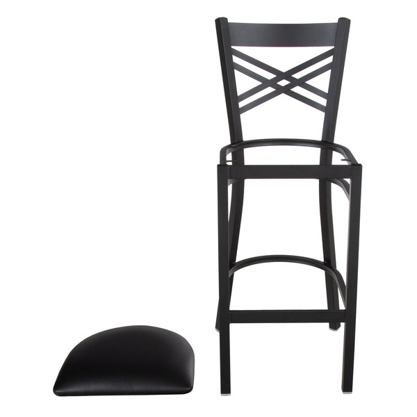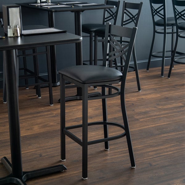 The Lancaster Table & Seating black cross back bar height chair with 2 1/2” padded seat is perfect for any bar, restaurant, bistro, or coffee shop. It offers the ultimate in style with its cross back and sleek black coloring. Plus, its bar height allows you to use it at both bar counters and raised tables for a more interesting dining room layout.