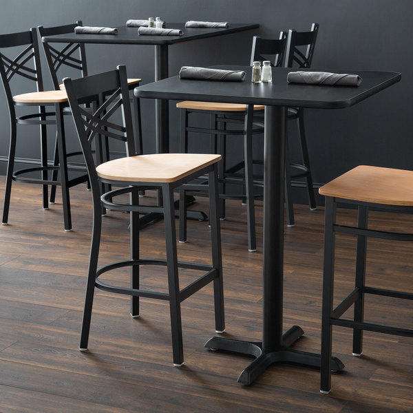 Featuring a durable plywood seat with a versatile natural finish, combined with a contemporary steel frame and trendy cross back design, this Lancaster Table & Seating black cross back bar height chair instills a modern look in any location. It’s perfect for both bar and raised table seating, and, since the chair’s back is contoured for a customer’s back, it will provide unmatched comfort while maintaining a distinct appearance.