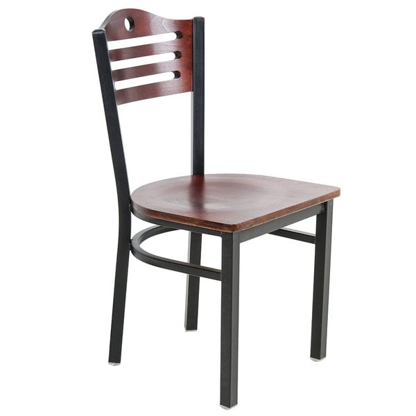 The Lancaster Table & Seating bistro dining chair is the perfect seating option for your contemporary eatery. The black metal frame contrasts with the mahogany wood finish, giving you an interesting, modern appearance. Thanks to its durable construction and comfortable design, this chair will withstand use in even the busiest restaurant.
