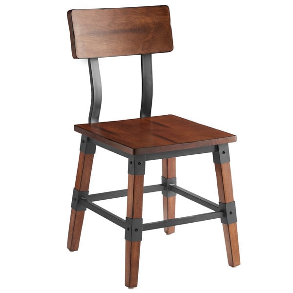 This Lancaster Table & Seating rustic industrial dining side chair is a great seating option for your restaurant, bistro, coffee shop, or cafe. The antique walnut stain gives a warm, natural look to your establishment and helps your customers feel comfortable and welcome. Plus, it has a seat height that allows guests to be perfectly positioned at tables.