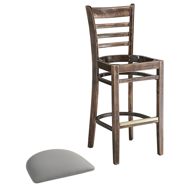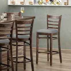 Seat your guests in comfort and style with this Lancaster Table & Seating vintage finish wooden ladder back bar height chair with light gray padded seat. This bar height chair has a sleek and sturdy European beechwood frame along with a comfortable and soft 2 1/2″ thick padded seat. Its back rest features a trendy ladder design that adds a modern look to any location. Because it is contoured for a customer’s back, it provides unmatched comfort while maintaining a distinct appearance. This bar height chair is designed with integrated plastic glides to protect your floors from scuffing. Its vintage copper finish provides an elegant, contemporary look that complements a variety of decor schemes. This reliable design ensures you’ll be using this chair in your bar, restaurant, or cafe for years to come! Overall Dimensions: Height: 44″ Seat Width: 16″ Seat Depth: 16 1/4″ Seat Height: 30 1/2″ Capacity: 300 lb.