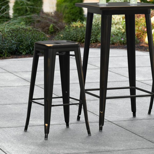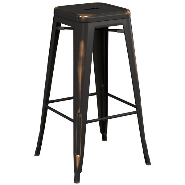 This stool is made of durable steel and double coated to withstand years of use. The distressed copper finish adds a modern look to any setting and is sure to be a design choice that guests love. Comfortable and stylish, this strong yet lightweight barstool is an excellent choice for your indoor or outdoor dining area.