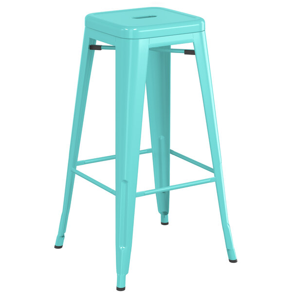 Take your modern restaurant, cafe, or bistro to the next level with this Lancaster Table & Seating Alloy Series seafoam metal indoor industrial cafe bar height stool with gray wood seat. Made with a durable steel construction, the frame has received an e-coating to seal it against rust. This treatment was followed with a seafoam powder coating to further enhance durability so you can rest assured that this bar height barstool is sure to withstand years of use. It features a footrest to reduce pressure on your customers’ legs and lower backs. The frame is reinforced with an additional under-seat cross bracing to provide strength and stability without adding extra bulk or weight to this sleek design. It’s lightweight enough for easy movement and transportation so you can quickly reconfigure your dining space and easily clean up at the end of the night. And it can even be stacked to maximize storage space if needed! To ensure that your customers are free to enjoy your signature drinks, appetizers, entrees, and desserts, this industrial bar height stool features a comfortable wooden seat that has been stained with a gray finish to enhance its natural wood grain appeal for a high quality look. To keep this stool looking clean, simply wipe it with a damp cloth and your preferred all purpose cleaner. It is also equipped with protective glides that help keep floor surfaces in pristine condition, making it an excellent choice for your indoor dining area. This item comes with the seat detached to save on shipping costs. All hardware for assembly is included. Overall Dimensions: Width: 16 1/8″ Depth: 16 1/8″ Height: 30 3/4″ Seat Width: 12 1/8″ Seat Depth: 12 1/8″ Weight Capacity: 400 lb.