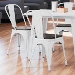 Made with a durable steel construction, the frame has received an e-coating to seal it against rust. This treatment was followed with a white powder coating to further enhance durability so you can rest assured that this supportive cafe chair is sure to withstand years of use. This item ships with the back and seat detached. All hardware for assembly is included.
