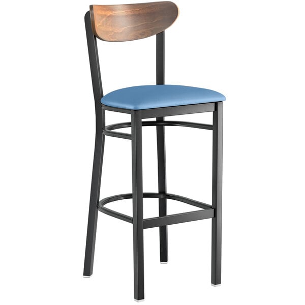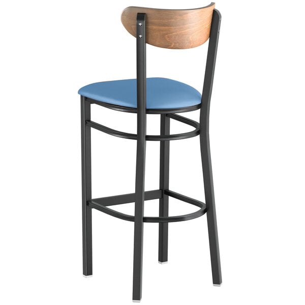 Flash Sale ❤️ LT&S Boomerang Series Lancaster Table & Seating Boomerang Bar Height Black Chair With Blue Vinyl Seat And Vintage Wood Back ????