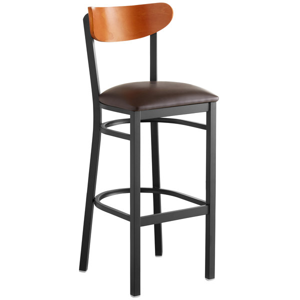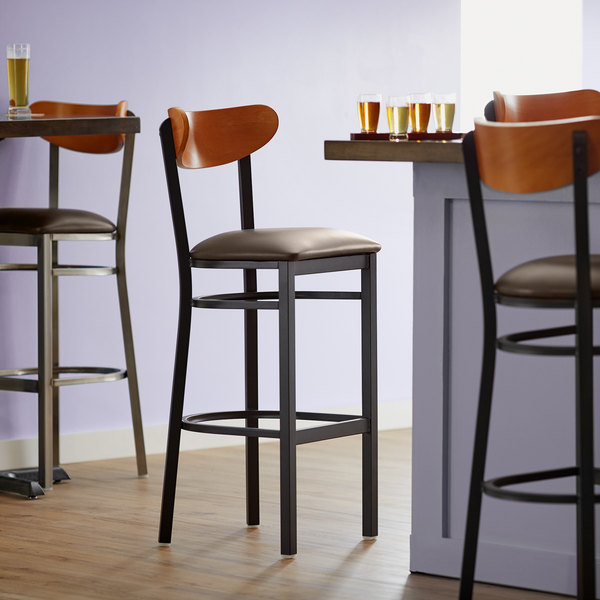 Best Sale ???? LT&S Boomerang Series Lancaster Table & Seating Boomerang Bar Height Black Chair With Dark Brown Vinyl Seat And Cherry Back ✔️