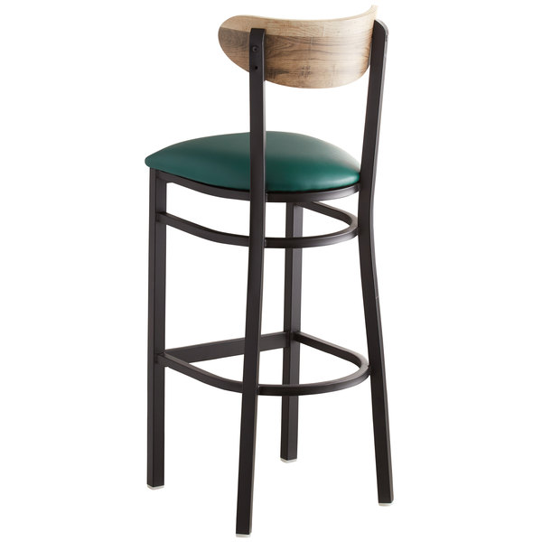 This Lancaster Table & Seating Boomerang bar height black chair has a contemporary steel frame along with a comfortable green vinyl seat and trendy driftwood back. This reliable and modern design ensures you’ll be using this bar height chair in your pub or restaurant for years to come