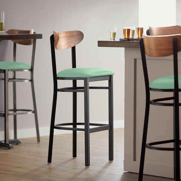 New ✔️ LT&S Boomerang Series Lancaster Table & Seating Boomerang Bar Height Black Chair With Seafoam Vinyl Seat And Vintage Wood Back ????