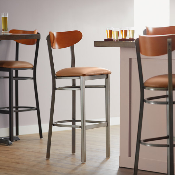 This Lancaster Table & Seating Boomerang bar height clear coat chair has a contemporary steel frame along with a comfortable light brown vinyl seat and trendy cherry back. This reliable and modern design ensures you’ll be using this bar height chair in your pub or restaurant for years to come.