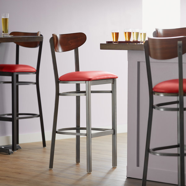 This Lancaster Table & Seating Boomerang bar height clear coat chair has a contemporary steel frame along with a comfortable red vinyl seat and trendy antique walnut back. This reliable and modern design ensures you’ll be using this bar height chair in your pub or restaurant for years to come.