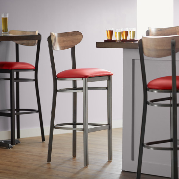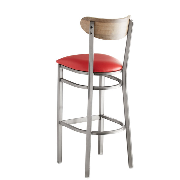 This Lancaster Table & Seating Boomerang bar height clear coat chair has a contemporary steel frame along with a comfortable red vinyl seat and trendy driftwood back. This reliable and modern design ensures you’ll be using this bar height chair in your pub or restaurant for years to come.