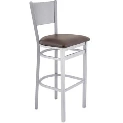 Whether patrons are sitting down for an intimate lunch at your bistro or a cup of coffee in your cafe, this BFM Seating 2140BDBV-SM Axel silver mist steel bar height chair with dark brown padded vinyl seat is sure to present them with a comfortable place to sit. Not only does its solid back provide optimal support, it also adds a distinct visual appeal to your restaurant, bar, or cafeteria. Plus, it features a dark brown padded vinyl seat for superior comfort and a convenient footrest to reduce the pressure on customers’ legs and lower backs. Made of durable box tube steel, this chair creates a sturdy, stable foundation that’s able to withstand daily, heavy-duty use. Additionally, the frame is powder coated with a silver mist finish to protect it from damage. Its legs are also capped with plastic glides that protect floors from scuff marks and slide smoothly, helping to keep loud, unwanted noise to a minimum. Boasting an ample 300 lb. weight capacity, this strong, attractive Axel chair provides guests with a way to comfortably enjoy your signature drinks, appetizers, entrees, and desserts! Overall Dimensions: Width: 16 1/4″ Depth: 18″ Height: 40 1/2″ Capacity: 300 lb. Seat Dimensions: Depth: 15 1/2″ Height: 30 1/4″