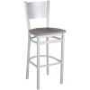 Ensure that your guests enjoy an ideal dining experience with this BFM Seating 2140BFHR-SM Axel silver mist steel solid back barstool with Relic farm house melamine seat. Perfect for bars, bistros, restaurants, or coffee shops, this item features an attractive yet durable steel frame with a silver mist powder coat finish. Its solid back design also offers optimal spinal support for increased comfort. It even pairs beautifully with the unique grains and lines of the Relic farm house seat! Plus, the melamine seat comes with a matching color fast PVC edge and mimics the look of solid wood without the extra cost and potentially cumbersome weight. Additionally, the convenient footrest helps reduce pressure on customers’ lower backs and legs. Made of welded 18 gauge steel, this barstool supplies a trendy look with a dependable foundation that’s able to withstand the wear and tear of everyday use. The melamine seat also provides better durability, while its MDF (medium-density fiberboard) core remains largely unaffected by changes in temperature or humidity. This barstool even features a 300 lb. weight capacity, making it an excellent seating option that your guests can rely on. Plus, its legs are capped with plastic glides that protect floors from scuff marks and slide smoothly to keep loud, unwanted noise to a minimum. Add this chair to your indoor bar height tables or countertops and allow your guests to enjoy their drinks, appetizers, entrees, or desserts in comfort! Overall Dimensions: Width: 17 1/4″ Depth: 18″ Height: 43 3/4″ Seat Width: 17 1/4″ Seat Depth: 16 1/2″ Seat Height: 30 1/2″ Back Height: 13 1/4″ Weight Capacity: 300 lb.