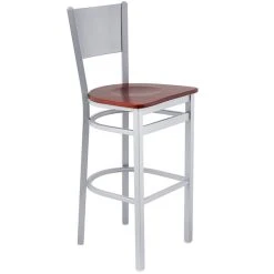 Whether patrons are sitting down for an intimate lunch at your bistro or a cup of coffee in your cafe, this BFM Seating 2140BMHW-SM Axel silver mist steel bar height chair with mahogany wood seat is sure to present them with a comfortable place to sit. Not only does its solid back provide optimal support, it also adds a distinct visual appeal to your restaurant, bar, or cafeteria. Plus, it features a contoured mahogany wooden seat for superior comfort and a convenient footrest to reduce the pressure on customers’ legs and lower backs. Made of durable box tube steel, this chair creates a sturdy, stable foundation that’s able to withstand daily, heavy-duty use. Additionally, the frame is powder coated with a silver mist finish to protect it from damage. Its legs are also capped with plastic glides that protect floors from scuff marks and slide smoothly, helping to keep loud, unwanted noise to a minimum. Boasting an ample 300 lb. weight capacity, this strong, attractive Axel chair provides guests with a way to comfortably enjoy your signature drinks, appetizers, entrees, and desserts! Overall Dimensions: Width: 16 1/4″ Depth: 18″ Height: 40 1/2″ Capacity: 300 lb. Seat Dimensions: Depth: 15 1/2″ Height: 30 1/4″