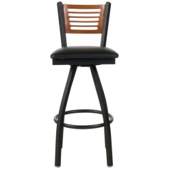 Complete your contemporary dining area with this BFM Seating 2151SBLV-CHSB Espy sand black metal bar height chair with cherry wooden back and 2″ black vinyl swivel seat! Not only does it feature a cushioned, vinyl seat for unmatched comfort and a swivel design that allows patrons to easily turn in their chairs and socialize with other guests, it also has a slotted, wooden backrest that is sure to add a modern touch to your restaurant, bistro, cafe, or catered event. Plus, the backrest has a professional, cherry finish that complements the black vinyl perfectly. Constructed with a sand black metal frame, this bar height chair boasts a convenient footrest to reduce the pressure on customers’ legs and lower backs and promote optimum relaxation. Its legs are connected with a support for additional stability and are capped with plastic glides to protect floors from scuff marks. The glides are also designed to slide smoothly and quietly, helping keep unwanted noise to a minimum. Add this sturdy, stylish chair to your indoor bar or high table tops and ensure guests can comfortably enjoy your signature drinks, appetizers, entrees, and desserts! Overall Dimensions: Height: 42 1/2″ Seat Width: 17 1/2″ Seat Depth: 16 1/2″ Seat Height: 30″ Cushion Thickness: 2″ Capacity: 250 lb.