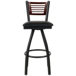 Complete your contemporary dining area with this BFM Seating 2151SBLV-WASB Espy sand black metal bar height chair with walnut wooden back and 2″ black vinyl swivel seat! Not only does it feature a cushioned, vinyl seat for unmatched comfort and a swivel design that allows patrons to easily turn in their chairs and socialize with other guests, it also has a slotted, wooden backrest that is sure to add a modern touch to your restaurant, bistro, cafe, or catered event. Plus, the backrest has a professional, walnut finish that complements the black vinyl perfectly. Constructed with a sand black metal frame, this bar height chair boasts a convenient footrest to reduce the pressure on customers’ legs and lower backs and promote optimum relaxation. Its legs are connected with a support for additional stability and are capped with plastic glides to protect floors from scuff marks. The glides are also designed to slide smoothly and quietly, helping keep unwanted noise to a minimum. Add this sturdy, stylish chair to your indoor bar or high table tops and ensure guests can comfortably enjoy your signature drinks, appetizers, entrees, and desserts! Overall Dimensions: Height: 42 1/2″ Seat Width: 17 1/2″ Seat Depth: 16 1/2″ Seat Height: 30″ Cushion Thickness: 2″ Capacity: 250 lb.