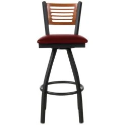 Complete your contemporary dining area with this BFM Seating 2151SBUV-CHSB Espy sand black metal bar height chair with cherry wooden back and 2″ burgundy vinyl swivel seat! Not only does it feature a cushioned, vinyl seat for unmatched comfort and a swivel design that allows patrons to easily turn in their chairs and socialize with other guests, it also has a slotted, wooden backrest that is sure to add a modern touch to your restaurant, bistro, cafe, or catered event. Plus, the backrest has a professional, cherry finish that complements the burgundy vinyl perfectly. Constructed with a sand black metal frame, this bar height chair boasts a convenient footrest to reduce the pressure on customers’ legs and lower backs and promote optimum relaxation. Its legs are connected with a support for additional stability and are capped with plastic glides to protect floors from scuff marks. The glides are also designed to slide smoothly and quietly, helping keep unwanted noise to a minimum. Add this sturdy, stylish chair to your indoor bar or high table tops and ensure guests can comfortably enjoy your signature drinks, appetizers, entrees, and desserts! Overall Dimensions: Height: 42 1/2″ Seat Width: 17 1/2″ Seat Depth: 16 1/2″ Seat Height: 30″ Cushion Thickness: 2″ Capacity: 250 lb.
