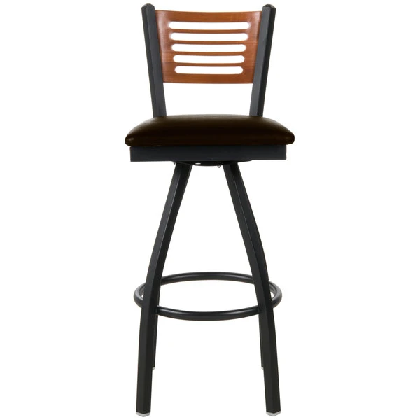Complete your contemporary dining area with this BFM Seating 2151SDBV-CHSB Espy sand black metal bar height chair with cherry wooden back and 2″ dark brown vinyl swivel seat! Not only does it feature a cushioned, vinyl seat for unmatched comfort and a swivel design that allows patrons to easily turn in their chairs and socialize with other guests, it also has a slotted, wooden backrest that is sure to add a modern touch to your restaurant, bistro, cafe, or catered event. Plus, the backrest has a professional, cherry finish that complements the dark brown vinyl perfectly. Constructed with a sand black metal frame, this bar height chair boasts a convenient footrest to reduce the pressure on customers’ legs and lower backs and promote optimum relaxation. Its legs are connected with a support for additional stability and are capped with plastic glides to protect floors from scuff marks. The glides are also designed to slide smoothly and quietly, helping keep unwanted noise to a minimum. Add this sturdy, stylish chair to your indoor bar or high table tops and ensure guests can comfortably enjoy your signature drinks, appetizers, entrees, and desserts! Overall Dimensions: Height: 42 1/2″ Seat Width: 17 1/2″ Seat Depth: 16 1/2″ Seat Height: 30″ Cushion Thickness: 2″ Capacity: 250 lb.