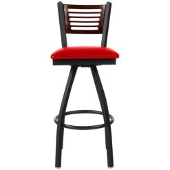 Complete your contemporary dining area with this BFM Seating 2151SRDV-WASB Espy sand black metal bar height chair with walnut wooden back and 2″ red vinyl swivel seat! Not only does it feature a cushioned, vinyl seat for unmatched comfort and a swivel design that allows patrons to easily turn in their chairs and socialize with other guests, it also has a slotted, wooden backrest that is sure to add a modern touch to your restaurant, bistro, cafe, or catered event. Plus, the backrest has a professional, walnut finish that complements the red vinyl perfectly. Constructed with a sand black metal frame, this bar height chair boasts a convenient footrest to reduce the pressure on customers’ legs and lower backs and promote optimum relaxation. Its legs are connected with a support for additional stability and are capped with plastic glides to protect floors from scuff marks. The glides are also designed to slide smoothly and quietly, helping keep unwanted noise to a minimum. Add this sturdy, stylish chair to your indoor bar or high table tops and ensure guests can comfortably enjoy your signature drinks, appetizers, entrees, and desserts! Overall Dimensions: Height: 42 1/2″ Seat Width: 17 1/2″ Seat Depth: 16 1/2″ Seat Height: 30″ Cushion Thickness: 2″ Capacity: 250 lb.