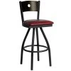 Complete your contemporary dining area with this BFM Seating 2152SCHW-CHSB Darby sand black metal bar height chair with cherry wooden back and swivel seat! Not only does it feature a contoured seat for unmatched comfort and a swivel design that allows patrons to easily turn in their chairs and socialize with other guests, it also has a wooden backrest with a cut-circle design that is sure to add a simple yet modern touch to your restaurant, bistro, cafe, or catered event. Plus, the backrest and seat both have a professional, cherry finish that’s perfect for any restaurant theme or atmosphere. Constructed with a sand black metal frame, this bar height chair boasts a convenient footrest to reduce the pressure on customers’ legs and lower backs and promote optimum relaxation. Its legs are connected with a support for additional stability and are capped with plastic glides to protect floors from scuff marks. The glides are also designed to slide smoothly and quietly, helping keep unwanted noise to a minimum. Add this sturdy, stylish chair to your indoor bar or high table tops and ensure guests can comfortably enjoy your signature drinks, appetizers, entrees, and desserts! Overall Dimensions: Height: 42 1/2″ Seat Width: 17 1/2″ Seat Depth: 16 1/2″ Seat Height: 30″ Capacity: 250 lb.