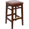 Add comfortable, modern seating to any area with this BFM Seating Stockton dark walnut beechwood square backless barstool with 2″ red vinyl seat. This barstool boasts a durable beechwood construction that resists chipping and scratching more than traditional woods. Its dark walnut stain creates a sleek, contemporary appearance while also helping to hide signs of wear better than lighter finishes. Plus, this barstool features a dipped, catalyzed lacquer finish that provides additional durability and accentuates the natural wood grain of the barstool’s frame. This Stockton barstool features a 2″ thick padded red vinyl seat for exceptional comfort and can be quickly cleaned with a vinyl cleaner or warm, soapy water. Its backless design offers your guests a wider range of motion than traditional barstools. It also has a convenient metal footrest to minimize wear and tear on the frame while reducing pressure on customers’ legs and lower backs for optimal relaxation. With its sleek styling, this BFM Seating Stockton barstool is sure to add contemporary flair to any of your seating areas. Overall Dimensions: Width: 15 3/4″ Depth: 15 1/2″ Height: 30″ Seat Width: 16 1/2″ Seat Depth: 16 1/2″ Seat Height: 30″ Weight Capacity: 250 lb.