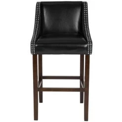 Dine and drink in style with this classy Flash Furniture CH-182020-30-BK-GG Carmel Series black leather bar stool with walnut frame and nail trim. This stool is a perfect addition to any space and is comfortable enough to relax in and elegant enough to complement brighter decor in a well-lit room as well. This classy bar height stool features a deep seat, supportive back, and nails accenting the curve of the arms. The LeatherSoft upholstery mimics the look and feel of real leather, but with added softness and durability to withstand constant use. In the absence of product-specific restrictions and weight limits, normal usage means use for no more than 40 hours per week by persons weighing 250 lbs. or less. This stool features added safety in the fire retardant foam padding that cushions the seat and back of the barstool. The sturdy walnut frame has a foot rest for added comfort and stability and is finished off with protective rubber floor glides to ensure the chairs tuck in smoothly and that your floors stay free from scuffs and scratches. The sleek black LeatherSoft upholstery seamlessly complements the walnut frame making this barstool easy to pair with the table or bar of your choice. This bar stool is not intended for commercial use. In the absence of product-specific restrictions and weight limits, normal usage means use for no more than 40 hours per week by persons weighing 250 lbs. or less. Overall Dimensions: Width: 20″ Depth: 22″ Height: 42″ Seat Dimensions Width: 17″ Depth: 17″ Height: 30″ Back Dimensions Width: 16″ Height: 13 1/2″