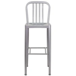 Create an urban look and feel to your dining area with this Flash Furniture CH-61200-30-SIL-GG 30″ silver metal indoor / outdoor bar height stool with vertical slat back! While its vertical slat back provides firm spinal support, the flat seat is easy to clean and ensures guests are at a comfortable height to enjoy your signature drinks, appetizers, entrees, and desserts. Made of sturdy galvanized steel, this chair is durable enough to withstand years of use. Thanks to its lightweight design, this chair allows for easy movement and transportation. Plus, it boasts convenient rubber glides to help keep floor surfaces in pristine condition. With a sleek silver powder coat finish, this chair is sure to be an excellent addition to your indoor or outdoor restaurant, bistro, or cafe. Overall Dimensions: Width: 15 1/2″ Depth: 20″ Height: 43″ Weight Capacity: 500 lb. Seat Dimensions: Width: 15 1/2″ Depth: 14″ Height: 30″ Back Dimensions: Width: 15 1/2″ Height: 13 3/4″