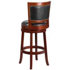 Add sophisticated, yet comfortable seating to any space with this Flash Furniture TA-355530-DC-GG dark cherry wood bar height panel back stool with walnut leather swivel seat! This stool features a swivel-style seat with nail-trimmed accents to provide a comfortable, yet eye-catching piece. The sleek, walnut LeatherSoft upholstery mimics the look and feel of natural leather, but with added softness and durability to withstand constant use. The cushioned panel back provides users with a convenient back rest, while a foot rest provides additional comfort and promotes relaxation. Plus, the seat is outfitted with fire-retardant foam. This stool features a dark cherry colored wood finish that pairs nicely with tables of nearly any color. It also comes with protective floor glides to help keep floor surfaces in pristine condition. Make sure you have plenty of seating available with this Flash Furniture bar height stool! In the absence of product-specific restrictions and weight limits, normal usage means use for no more than 40 hours per week by persons weighing 250 lbs. or less. Overall Dimensions: Width: 21 1/4″ Depth: 19 1/4″ Height: 44″ Seat Dimensions: Top Diameter: 16 1/2″ Height: 30 1/2″ Back Dimensions: Width: 16″ Height: 13 1/2″