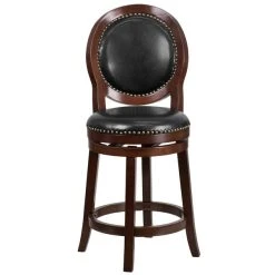 Add sophisticated, yet comfortable seating to any space with this Flash Furniture TA-550126-CA-GG cappuccino wood counter height oval back stool with black leather swivel seat! This stool features a swivel-style seat with nail-trimmed accents to provide a comfortable, yet eye-catching piece. The sleek, black LeatherSoft upholstery mimics the look and feel of natural leather, but with added softness and durability to withstand light-duty use. The cushioned oval back provides users with a convenient back rest, while a foot rest provides additional comfort and promotes relaxation. Plus, the seat is outfitted with fire-retardant foam. This stool features a cappuccino colored wood finish that pairs nicely with tables of nearly any color. It also comes with protective floor glides to help keep floor surfaces in pristine condition. Make sure you have plenty of seating available with this Flash Furniture counter height stool! Ships unassembled, see attached resources for assembly instructions. Overall Dimensions: Width: 22 1/4″ Depth: 23″ Height: 44 1/4″ Seat Dimensions: Top Diameter: 18″ Height: 26 1/2″ Back Dimensions: Width: 17″ Height: 18 1/2″