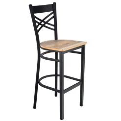 Featuring a durable wood seat with a driftwood finish and a contemporary steel frame with a trendy cross back design, this Lancaster Table & Seating cross back chair instills a modern look in any location. Its style and bar height design make it great for a trendy cafe or bar, perfect for use at high tables and counters. Plus, since the chair’s back is contoured for a customer’s back, it will provide unmatched comfort while maintaining a distinct appearance.