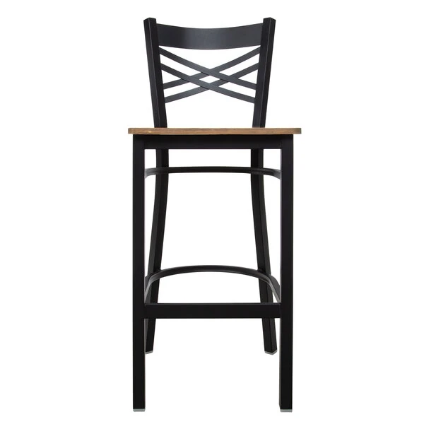 Seat your guests in comfort and style with this Lancaster table & Seating black cross back bar height chair with vintage wood seat! This bar height chair has a contemporary steel frame along with a vintage wood seat and trendy cross back design back rest. The cross back design is both sturdy and stylish, instilling a modern look in any location. Whatever your needs are, you can also choose to ship this bar height chair assembled or unassembled. It’s perfect for both bar and raised table seating, and since the chair’s back is contoured, it will provide unmatched comfort while maintaining a distinct appearance. This chair is designed with integrated glides to protect your floors from scuffing. At the same time, the black powder coat on the chair ensures longevity even through everyday wear and tear, resisting stains, scratches, and smudges. This reliable and modern design ensures you’ll be using this bar height chair in your pub or restaurant for years to come. Overall Dimensions: Height: 42 1/4″ Seat Width: 17″ Seat Depth: 19″ Seat Height: 28″ Capacity: 330 lb.