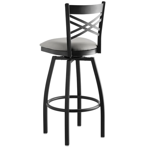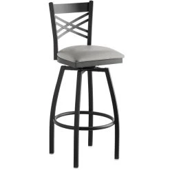 Seat your guests in comfort and style with this Lancaster Table & Seating black cross back swivel bar height chair with light gray padded seat. This bar height chair has a sleek and sturdy metal frame along with a comfortable and soft 2 1/2″ thick vinyl padded seat. Its back rest features a trendy cross back design that adds a modern look to any location. Because it is contoured for a customer’s back, it provides unmatched comfort while maintaining a distinct appearance. The swivel design and foot rest allow patrons to turn in their chairs to comfortably socialize and fully enjoy your venue. This bar height chair is designed with integrated plastic glides to protect your floors from scuffing. The black powder coat on the frame adds a modern touch and ensures longevity even through everyday wear and tear – resisting stains, scratches, and smudges. This reliable design ensures you’ll be using this bar height chair in your bar or restaurant for years to come! Overall Dimensions: Height: 44 1/2″ Seat Width: 16 3/4″ Seat Depth: 16 1/2″ Seat Height: 31 1/2″ Capacity: 300 lb.